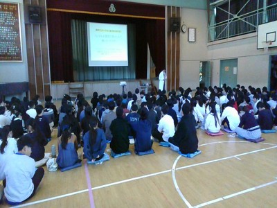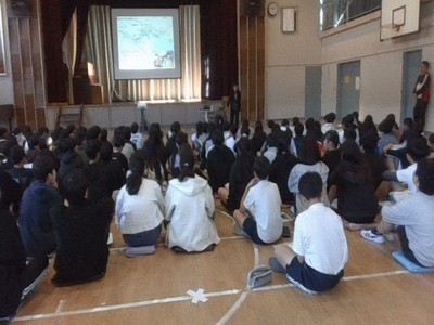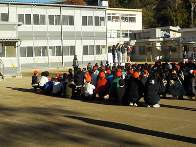 校庭がぬかるんでいるため、オンライン全校朝会です。