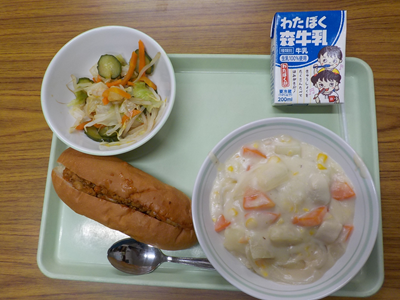 【献立】チリコンカンドッグ、コーンシチュー、ボイルサラダ、牛乳