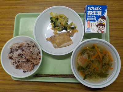 【献立】赤飯、鶏のお狩場焼き、おひたし、祝いすまし汁、牛乳