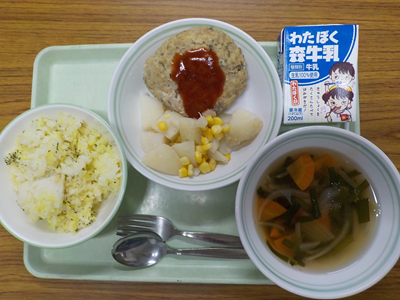 【献立】ガーリックライス、ごぼうハンバーグ、ポテコーン、にらスープ、牛乳