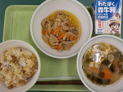 【献立】山坂達者飯、豚肉と大根の煮物、すまし汁、牛乳