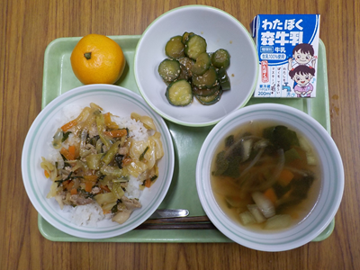 【献立】プルコギ丼、ピリ辛きゅうり、青梗菜のスープ、みかん、牛乳