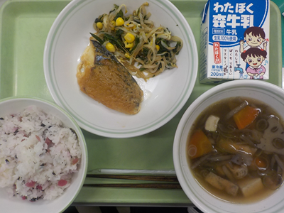 【献立】ごはん、鯖の胡麻みそやき、小松菜のお浸し、けんちん汁、牛乳