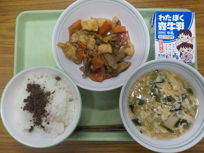 【献立】木島平ごはん、かつおふりかけ、チキンチキンごぼう、かきたま汁、牛乳