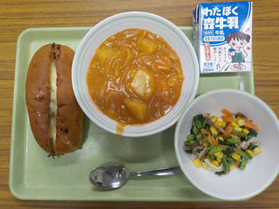 【献立】レンズ豆キーマカレーライス、コーンサラダ、キャベツのスープ、牛乳