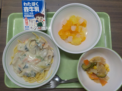 【献立】鮭のクリームソーススパゲティ、大根サラダ、ナタデココフルーツ、牛乳