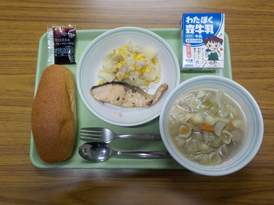 【献立】胚芽パン、ブルーベリージャム、グリラットロヒ(鮭のオーブン焼き)、コーンポテト、シスコンマッカラケイット(スープ)、牛乳