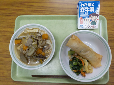 【献立】かぼちゃうどん、春巻き、ゆずドレッシングサラダ、牛乳