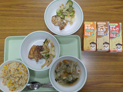 【献立】シーフードピラフ、ガーリックチキン、水菜のサラダ、ジュリエンヌスープ、牛乳