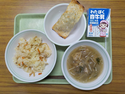 【献立】たけのこごはん、鯖の生姜揚げ、磯かおり和え、根菜汁、牛乳