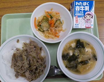 【献立】中華焼肉丼、大根の華風和え、わかめスープ、牛乳