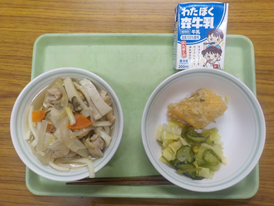 【献立】あぶらふどん、笹かまぼこサラダ、味噌汁、牛乳