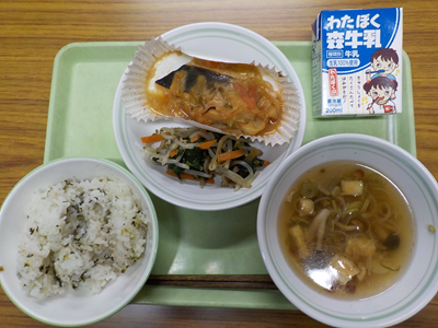 【献立】ごはん、鯖の胡麻みそやき、小松菜のお浸し、けんちん汁、牛乳
