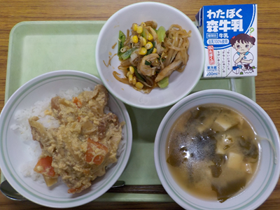 【献立】鶏肉とピーマンのバラ天丼、キャベツのゆかり和え、ふの澄まし汁、牛乳