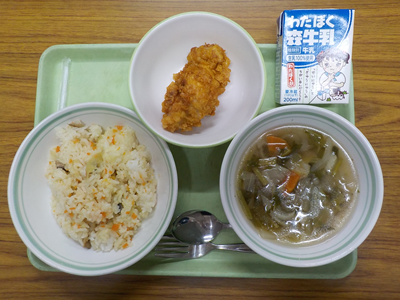 【献立】たけのこごはん、鯖の生姜揚げ、磯かおり和え、根菜汁、牛乳