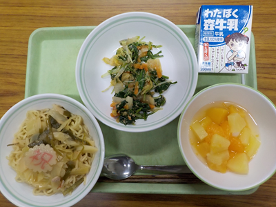 【献立】しょうゆラーメン、大豆サラダ、フルーツポンチ、牛乳