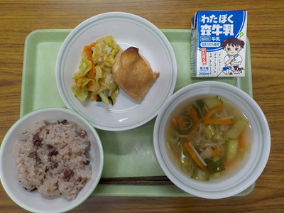 【献立】赤飯、鶏の味噌照り焼き、野菜甘酢和え、澄まし汁、牛乳